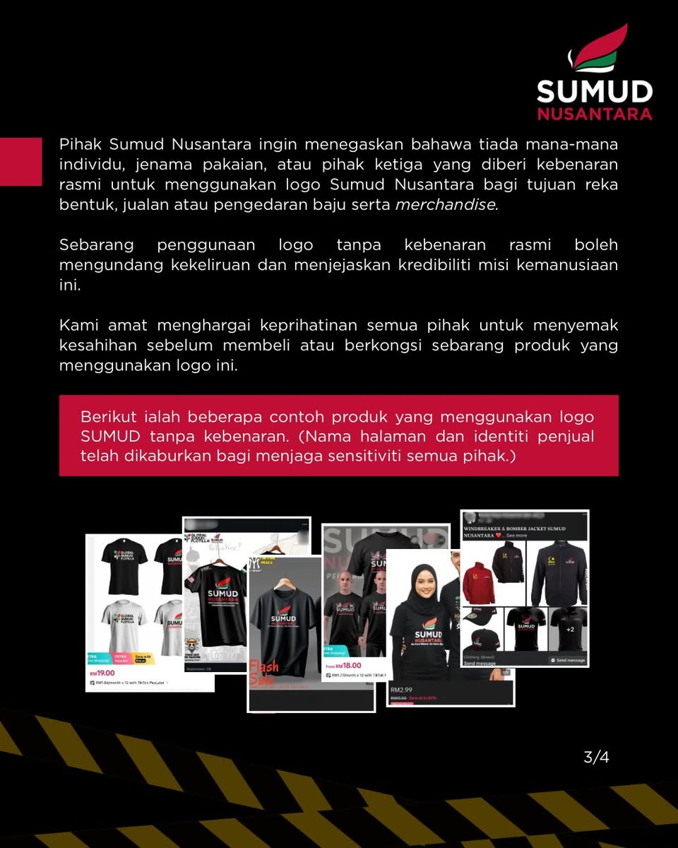 “Orang ramai dinasihatkan untuk tidak memuat naik, mengedarkan atau menjual sebarang baju, topi, jaket atau merchandise yang menggunakan logo Sumud Nusantara tanpa izin bertulis,”menurut kenyataan itu, hari ini.