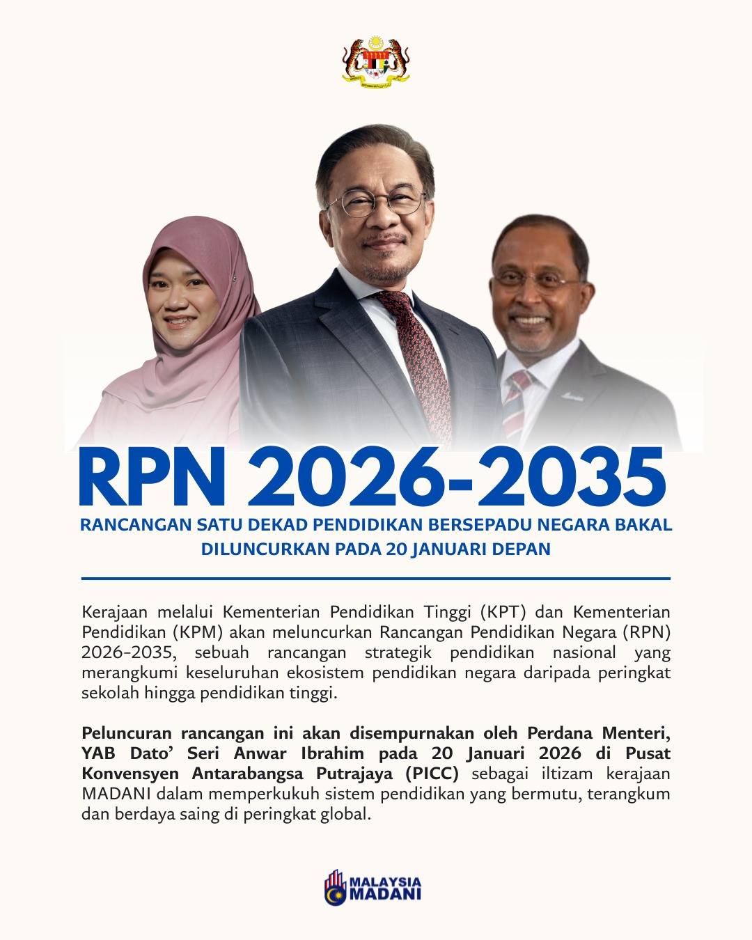 Sementara itu, Rancangan Pendidikan Malaysia (RPM) 2026–2035 yang diketuai KPM pula menekankan tujuh teras strategik dan 49 prakarsa berimpak tinggi.