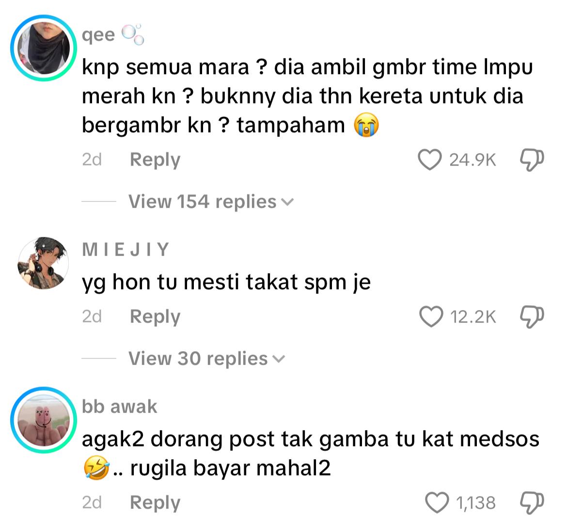 Menjengah ke ruangan komen, warganet meluahkan rasa kurang senang melihat sikap penunggang motosikal yang dianggap berlebihan dengan membunyikan hon biarpun gambar itu diambil sewaktu kenderaan sudah berhenti di lampu merah.