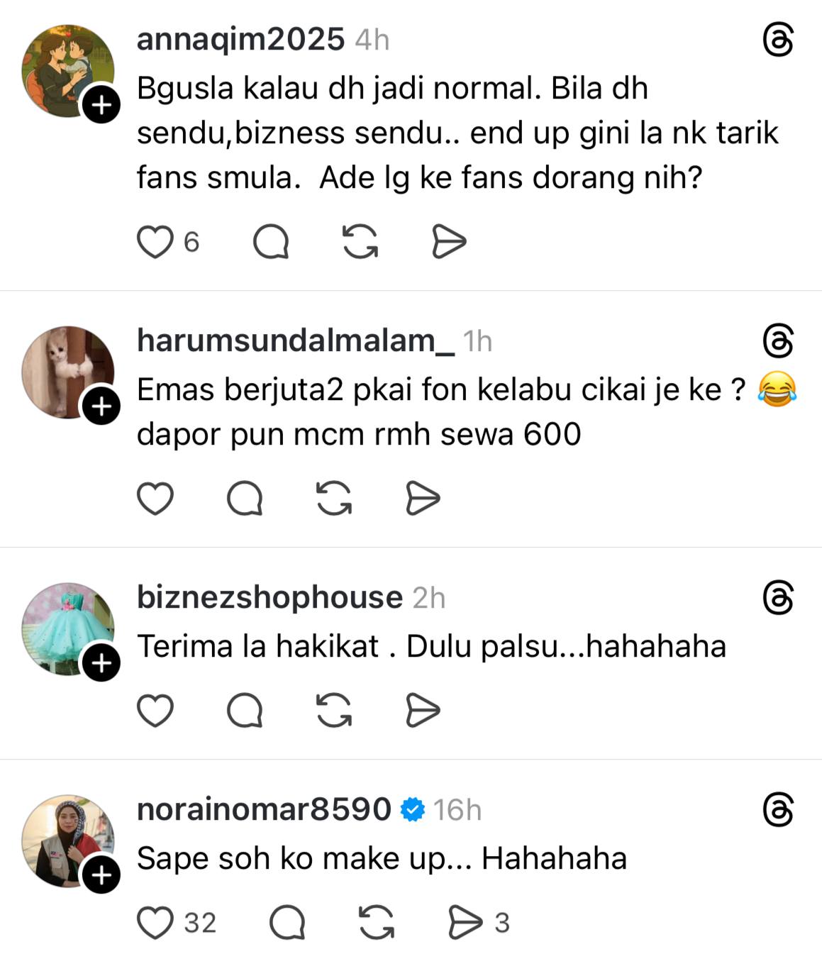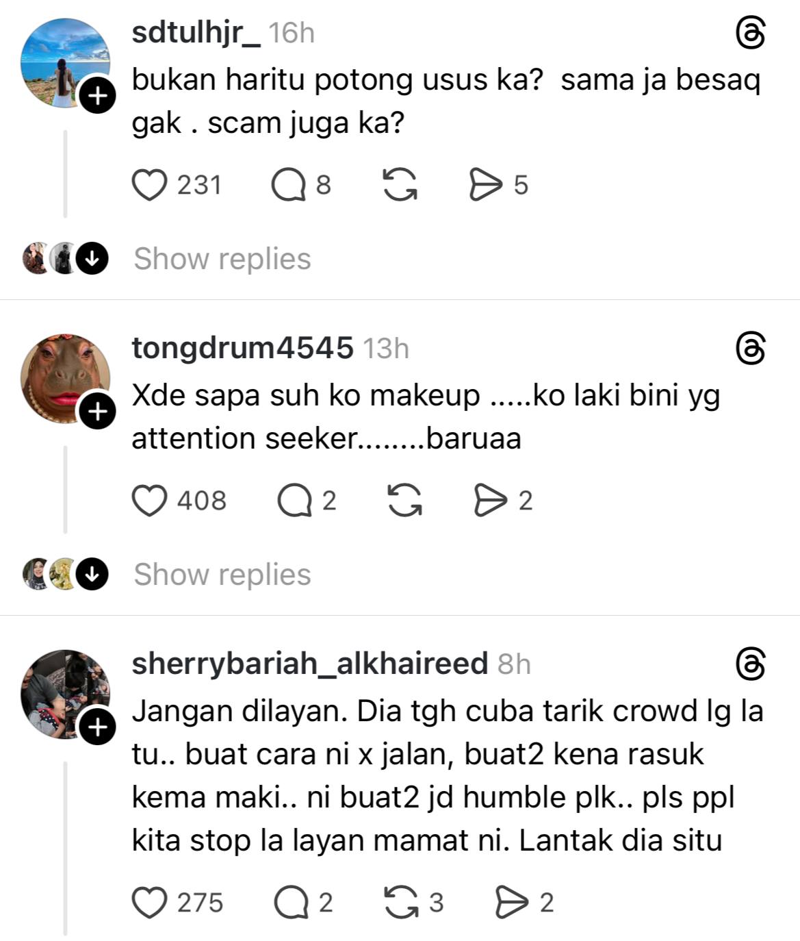 Meninjau ke ruangan komen, warganet terus mengecam usahawan itu dan menyatakan keputusan untuk tampil berlebihan adalah kehendak sendiri dan bukannya atas paksaan netizen.