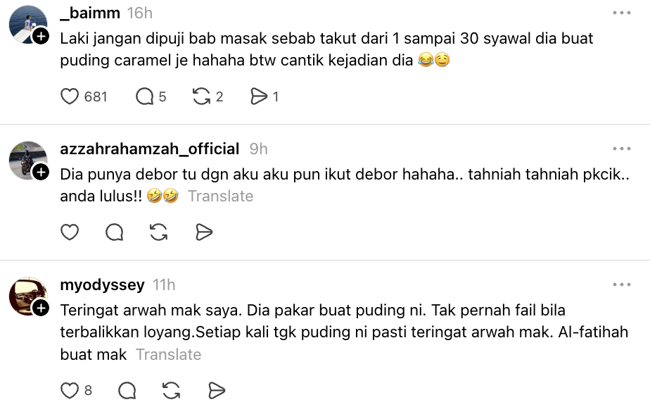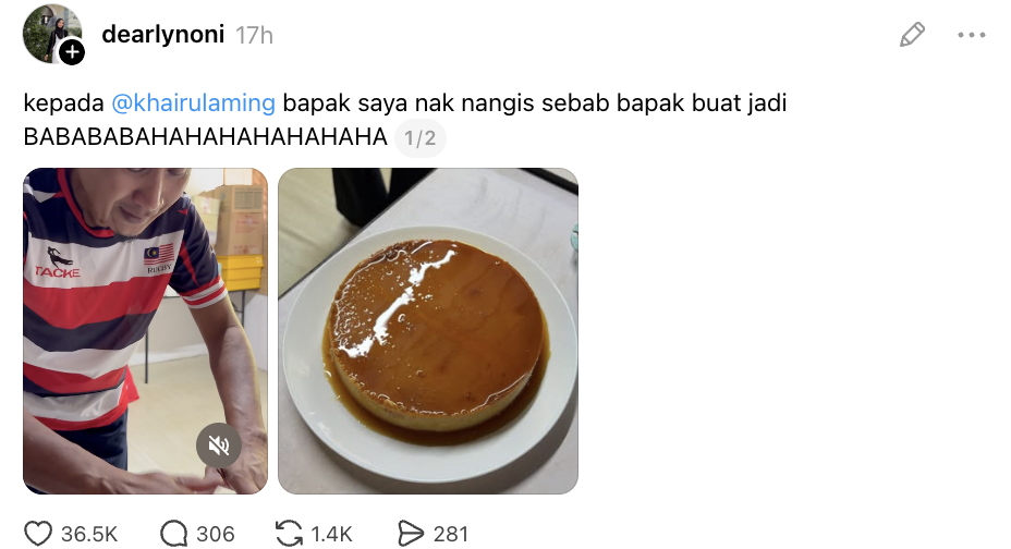 Seorang pengguna Threads berkongsi momen lucu apabila bapanya hampir saja menangis kerana risau puding karamel yang dibuat mengikut resepi pempengaruh, Khairul Aming tidak menjadi.