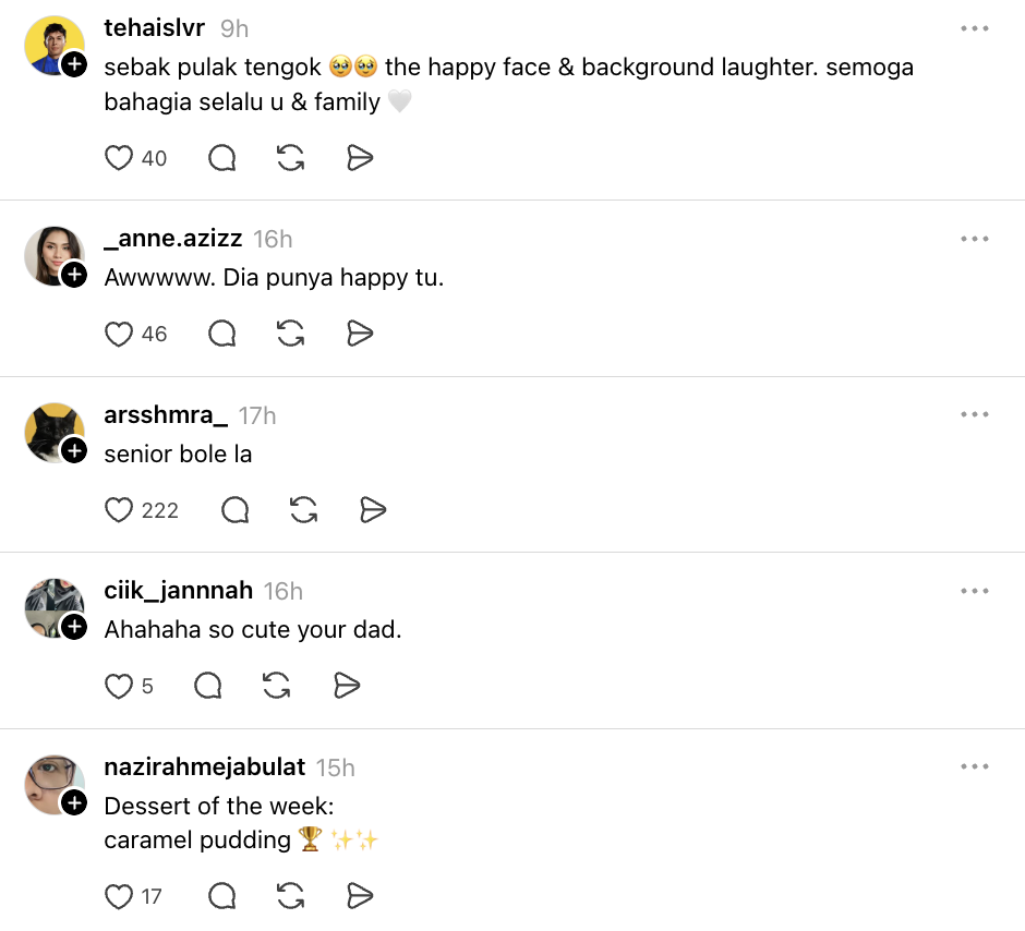 Perkongsian tersebut telah mendapat perhatian ramai apabila rata-rata terhibur dengan reaksi bapa pengguna Threads berkenaan.