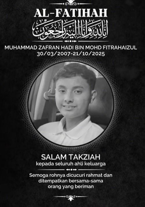 “Dengan penuh dukacita dan reda terhadap ketentuan Ilahi, kami memaklumkan bahawa Muhammad Zafran Hadi Mohd Fitrahaizul telah kembali ke rahmatullah pada hari ini,” menurut kenyataan keluarga.