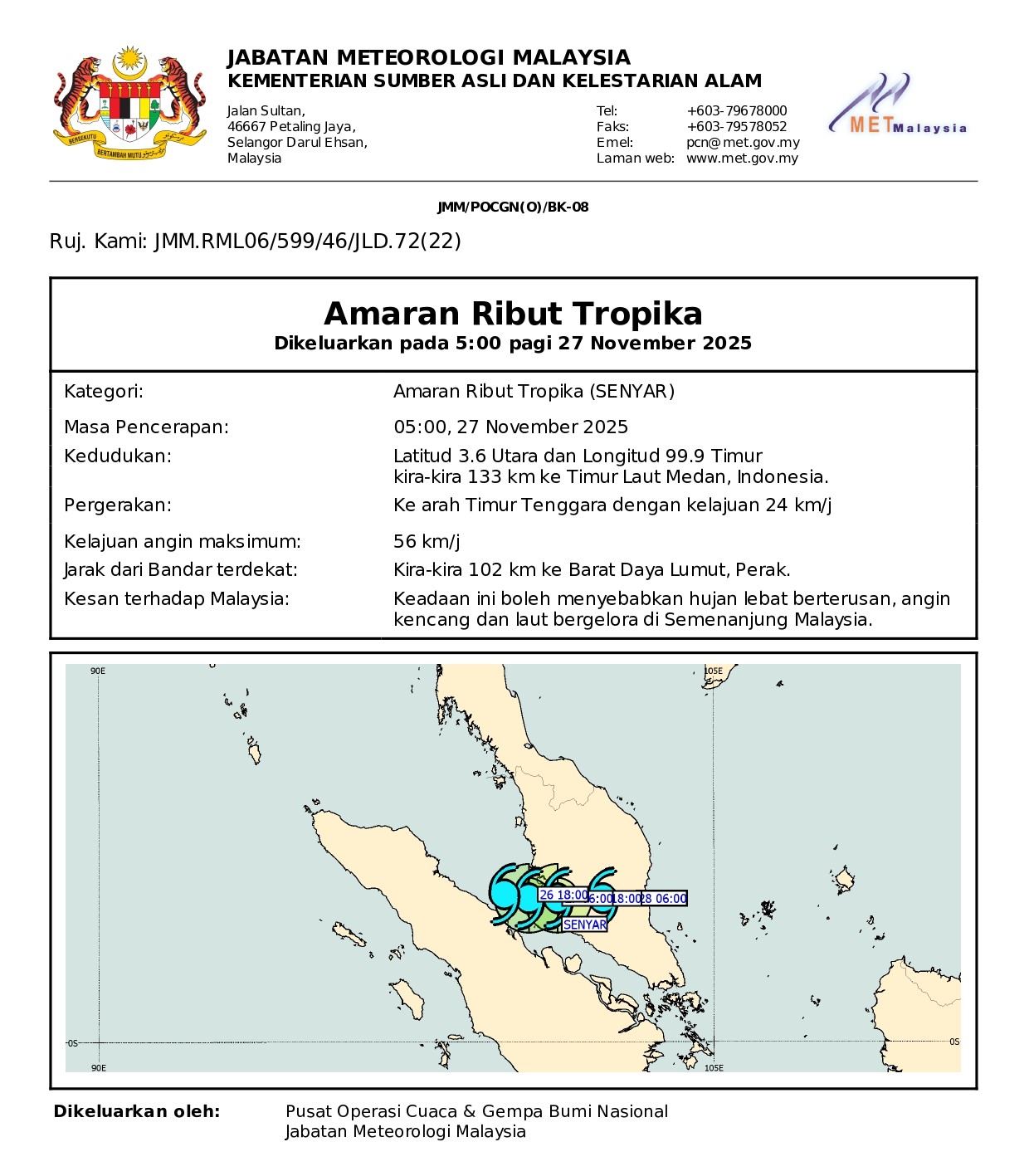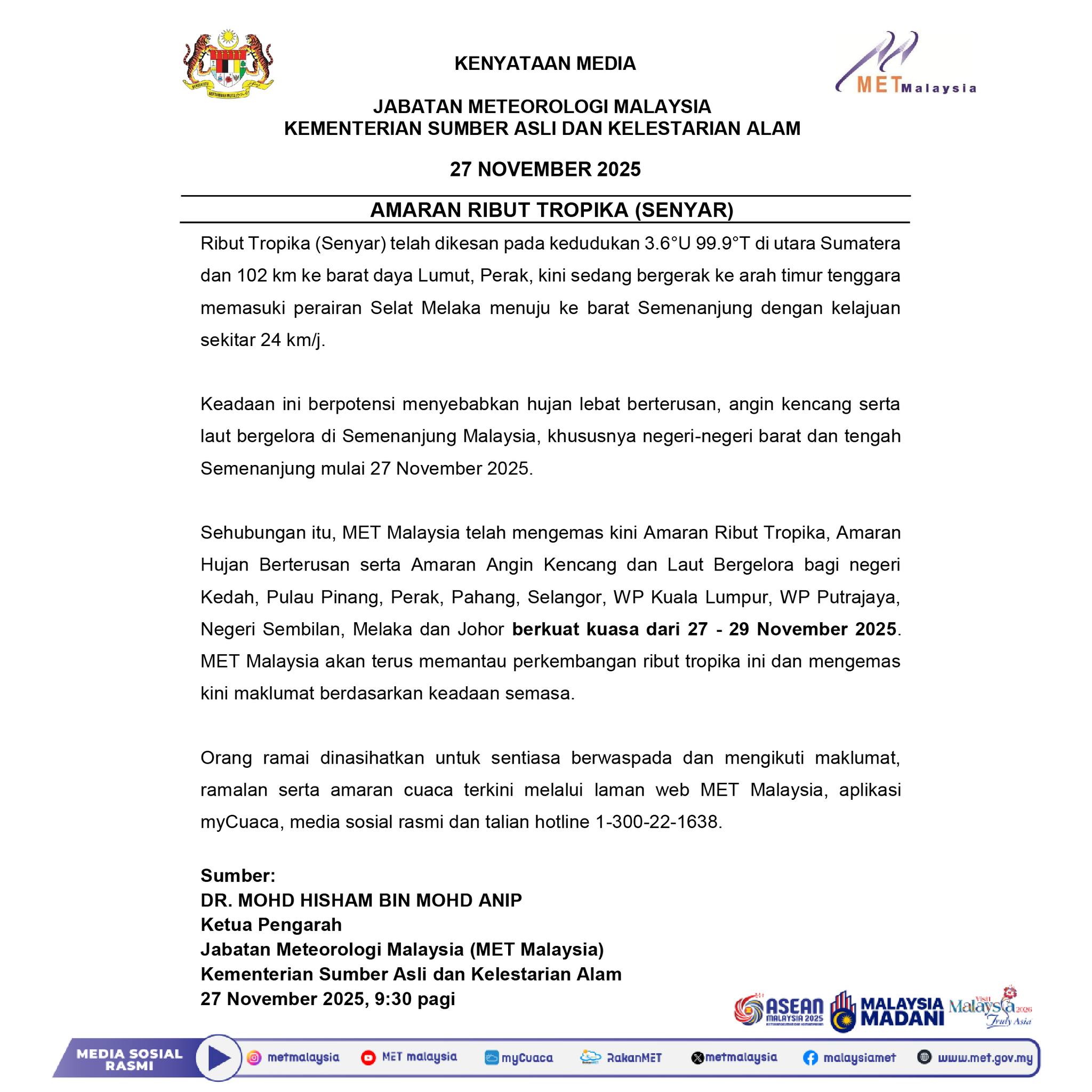 Sehubungan itu, MET Malaysia mengemas kini beberapa amaran meliputi Amaran Ribut Tropika, Amaran Hujan Berterusan serta Amaran Angin Kencang dan Laut Bergelora bagi negeri Kedah, Pulau Pinang, Perak, Pahang, Selangor, WP Kuala Lumpur, WP Putrajaya, Negeri Sembilan, Melaka dan Johor yang berkuat kuasa dari 27 hingga 29 November 2025.