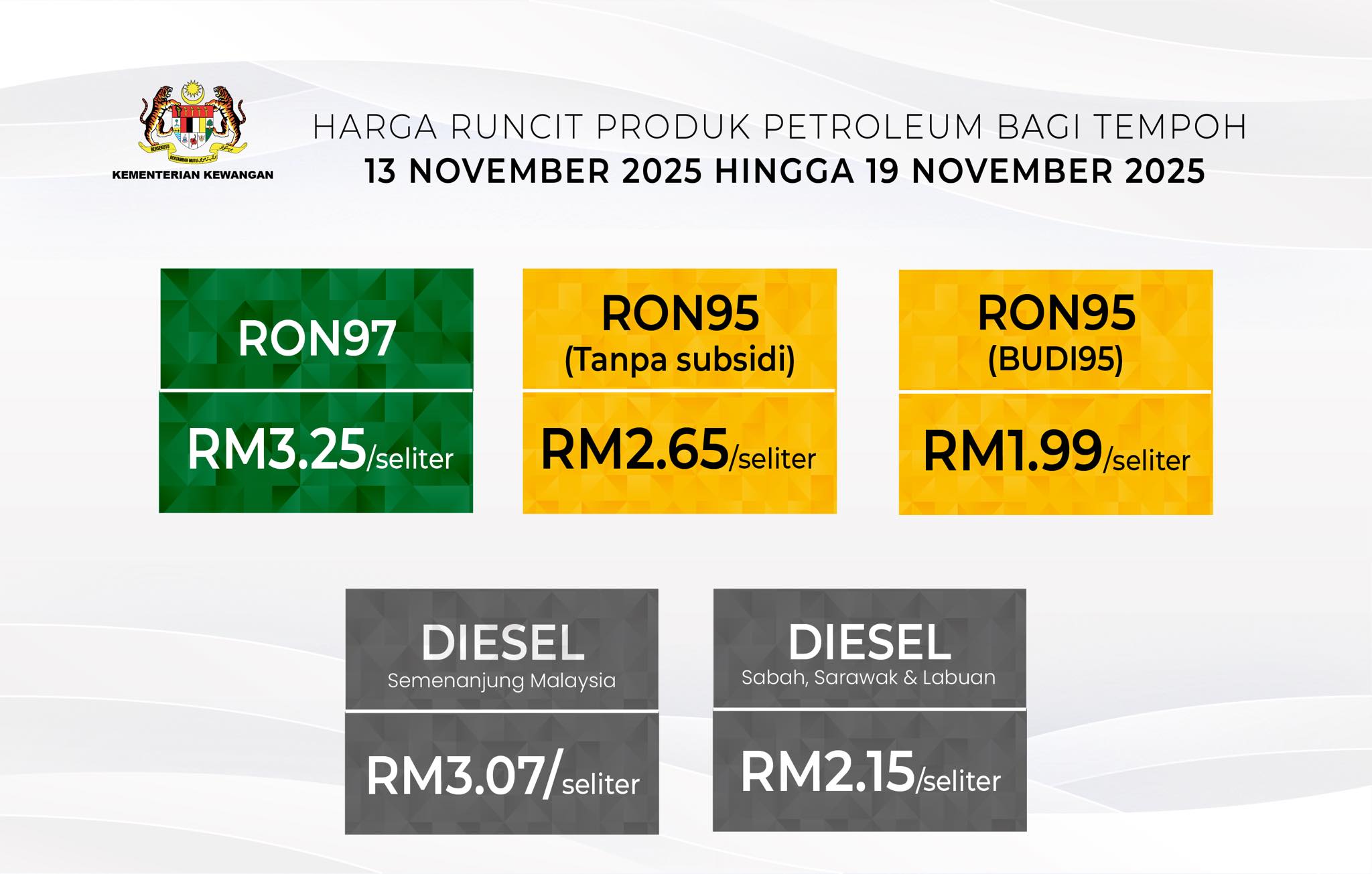 Menerusi kenyataan dikeluarkan MOF, harga baharu ditetapkan RON97 pada RM3.25 seliter, RON95 tanpa subsidi RM2.65 seliter, manakala diesel di Semenanjung Malaysia RM3.07 seliter.
