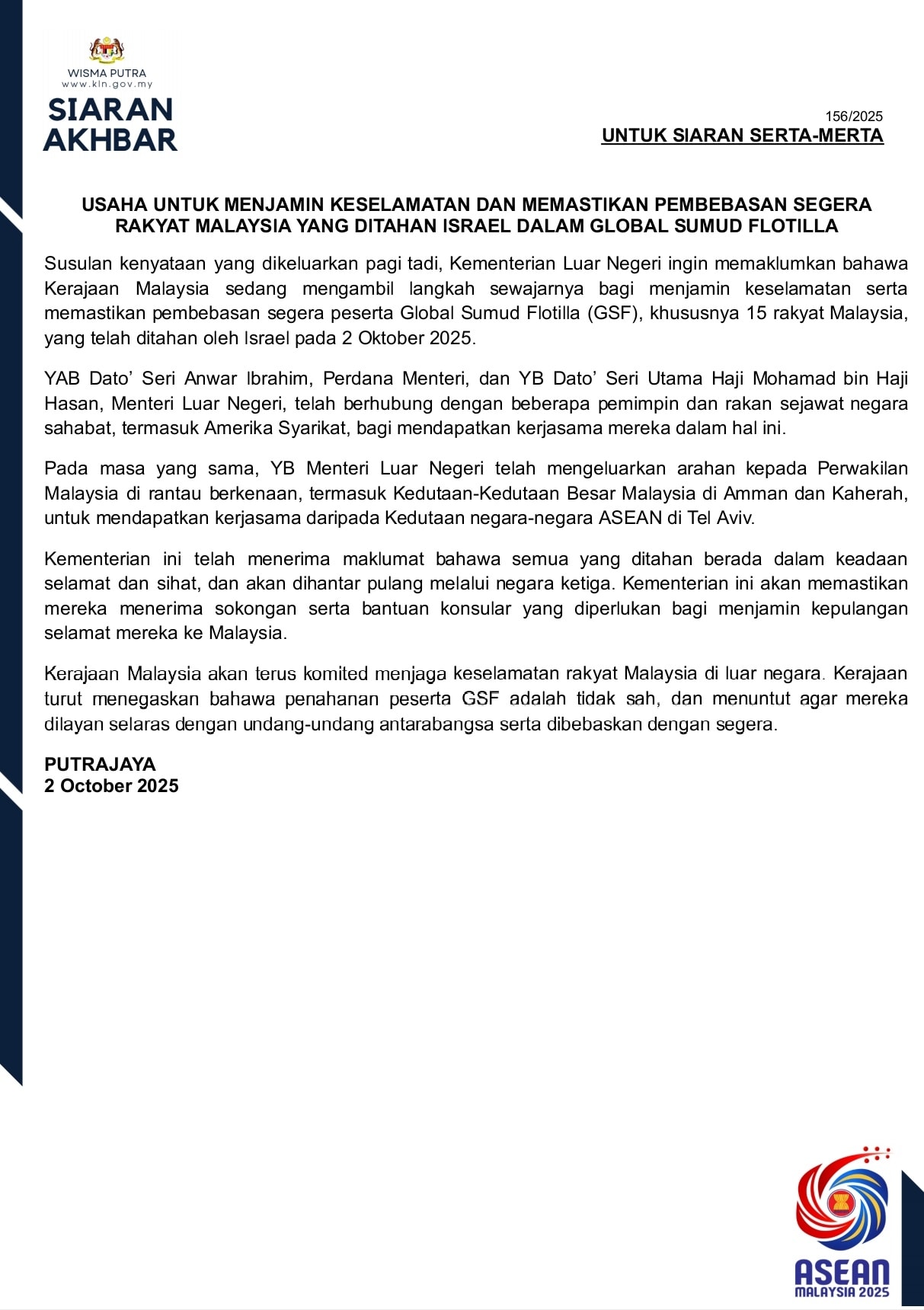 Kementerian Luar Negeri mengesahkan semua rakyat Malaysia yang ditahan tentera Israel berada dalam keadaan selamat, sihat dan akan dihantar pulang melalui negara ketiga.