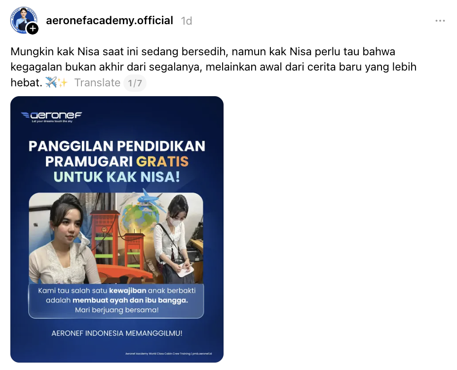 “Mungkin Nisa saat ini sedang bersedih, namun Nisa perlu tahu bahwa kegagalan bukan akhir dari segalanya, melainkan awal dari cerita baru yang lebih hebat,” tulis akaun @aeronefacademy.official.