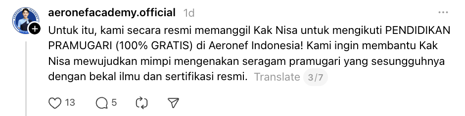 Pihak Aeronef Academy turut meminta Khairun Nisa menghubungi mereka melalui DM Instagram bagi mendapatkan maklumat lanjut berhubung tawaran pendidikan berkenaan.
