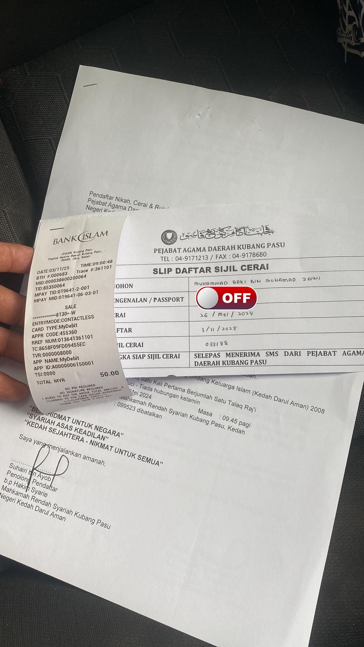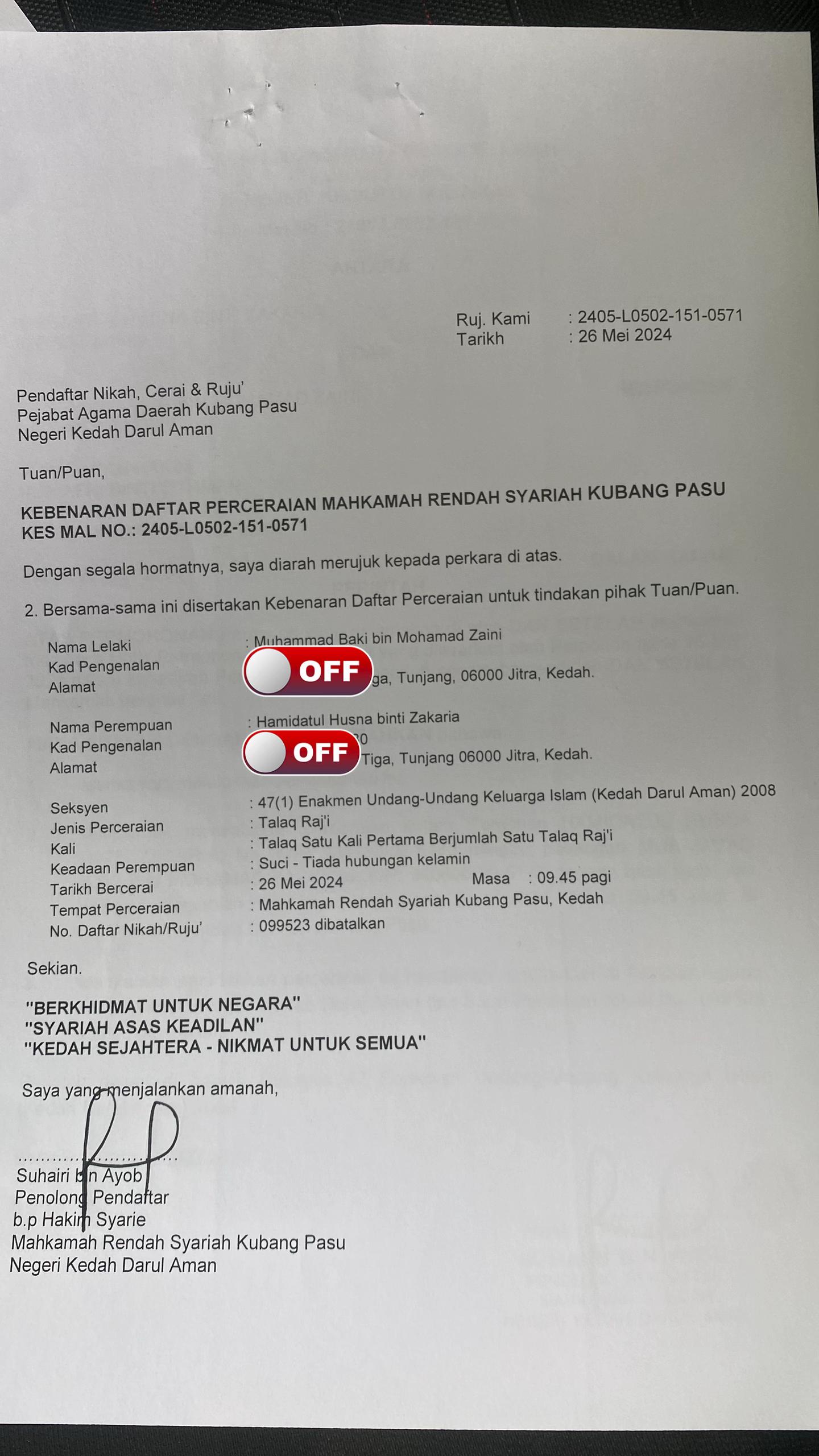 Menurutnya, sijil perceraian tersebut sah dan masih berada di pejabat agama atas urusan tertentu.