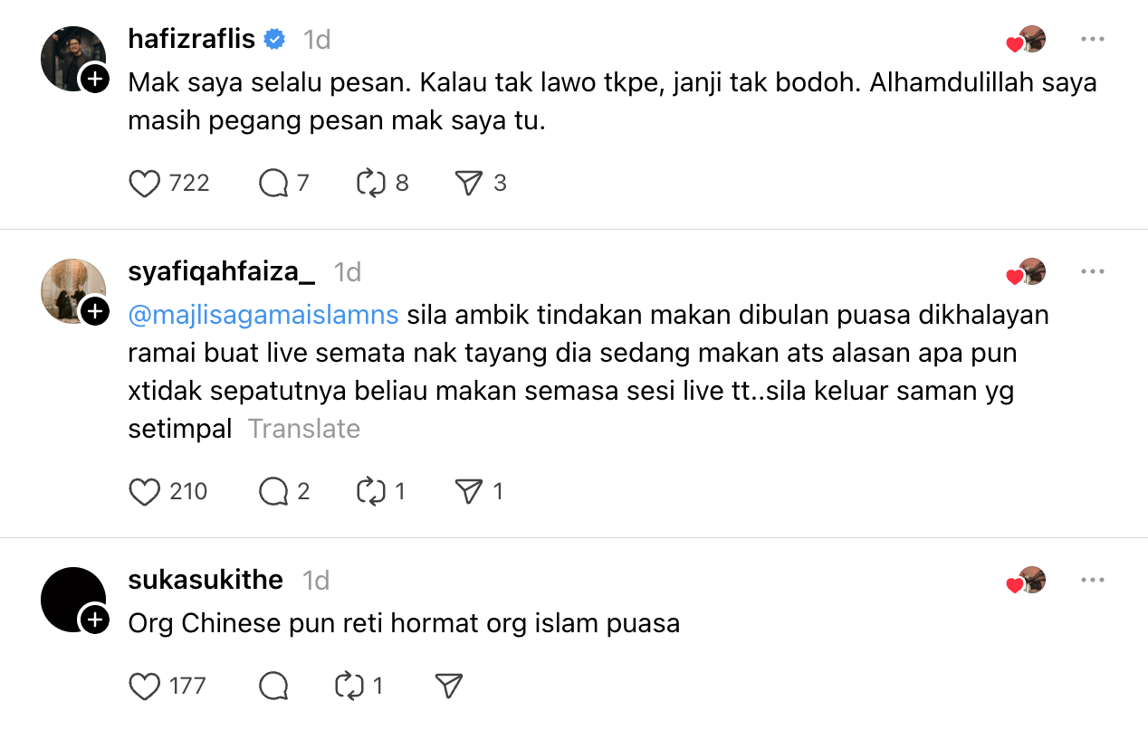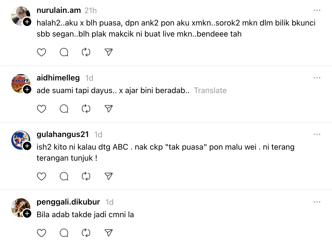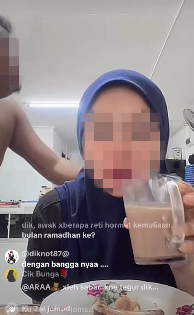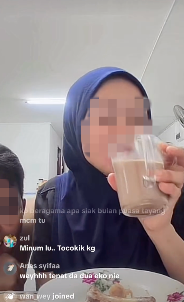 “Saya agama Islam awak, minum dulu tercekik (sambil ketawa). (Baca komen) ‘hormatlah dengan orang berpuasa’, ‘tak suka, boleh angkat kaki, boleh jalan’, ‘dalam pantang ke kak’, aah dalam pantang. (Baca komen) ‘wah tak puasa’, aah tak puasa.