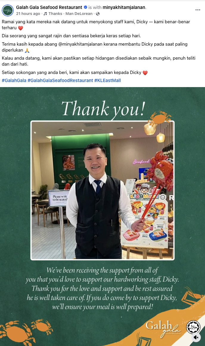 Di akhir perkongsian tersebut, pihak Galah Gala Restaurant menyatakan setiap sokongan yang diberikan kepada staf mereka akan disampaikan dan sangat gembira dengan kata-kata positif.