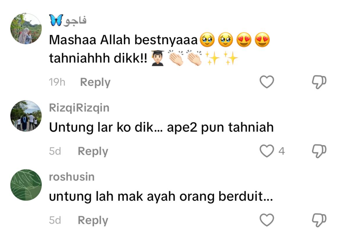 Bagaimanapun ada juga yang meluahkan rasa kurang senang dengan perkongsian tersebut dengan menyatakan graduan itu bersenang-lenang kerana dilahirkan dalam kelurga yang kaya.