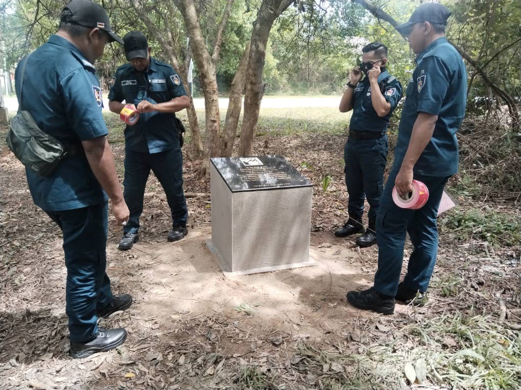 “Polis segera datang, namun tiada sebarang kerosakan pada tugu berkenaan. Difahamkan, individu bertanggungjawab cuba mengambil batu yang berukiran di atas tugu itu,” katanya.