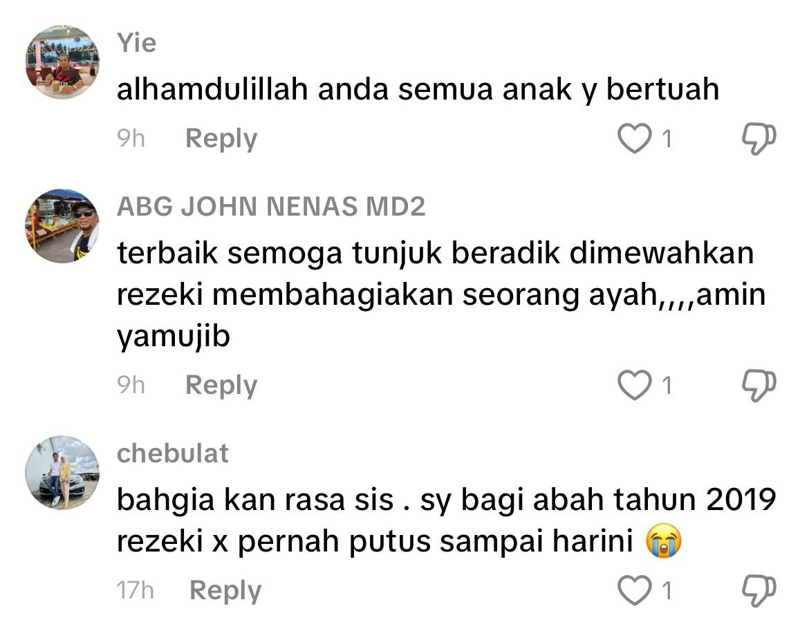Meninjau ke ruangan komen, warganet terharu melihat perkongsian itu dan ada juga yang meluahkan rasa sebak tidak sempat untuk berbakti kepada bapa mereka kerana sudah dijemput ilahi.