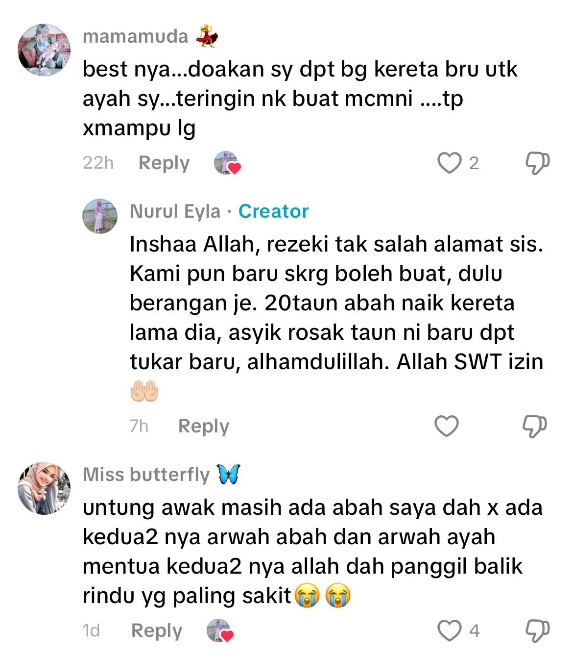 “Kalau ma (ibu) ada boleh bawa gi jalan-jalan, tapi ma dah takde. Abah ngopi je lah ya dengan kereta baharu,” luahnya.