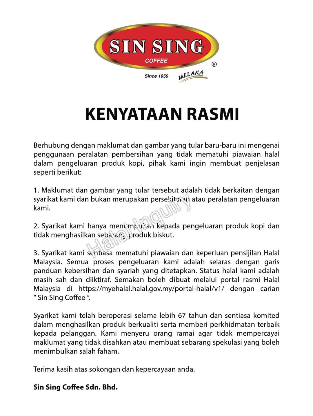 Syarikat Sin Sing Coffee Sdn Bhd tampil menafikan dakwaan yang mengaitkan mereka dengan penarikan sijil halal susulan isu penggunaan berus bulu babi yang tular di media sosial sejak Rabu.