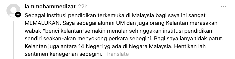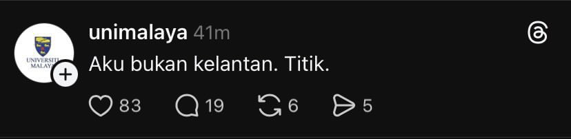Sebelum ini, tular di media sosial hantaran dibuat oleh pengendali akaun Thread UM yang menyebut ‘Aku bukan Kelantan. Titik’ sehingga membuatkan banyak pihak tidak selesa dengan perkongsian universiti terkemuka negara itu.