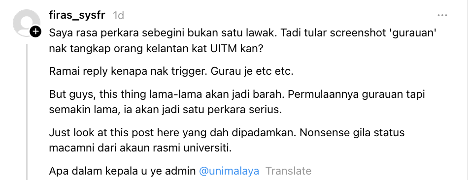 Ada diantara pengguna Thread mempersoalkan tindakan pengendali akaun UM yang menjadikan isu rasis sebagai hantaran umum di media sosial dan menganggap ia sebagai satu bentuk gurauan.