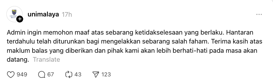 Menerusi perkongsian itu, pihak UM memohon maaf andai ada pihak yang tidak selesa dengan perkongsian tersebut dan sudahpun menurunkannya dari platform berkenaan.