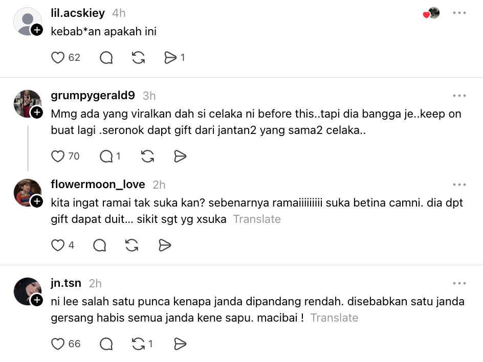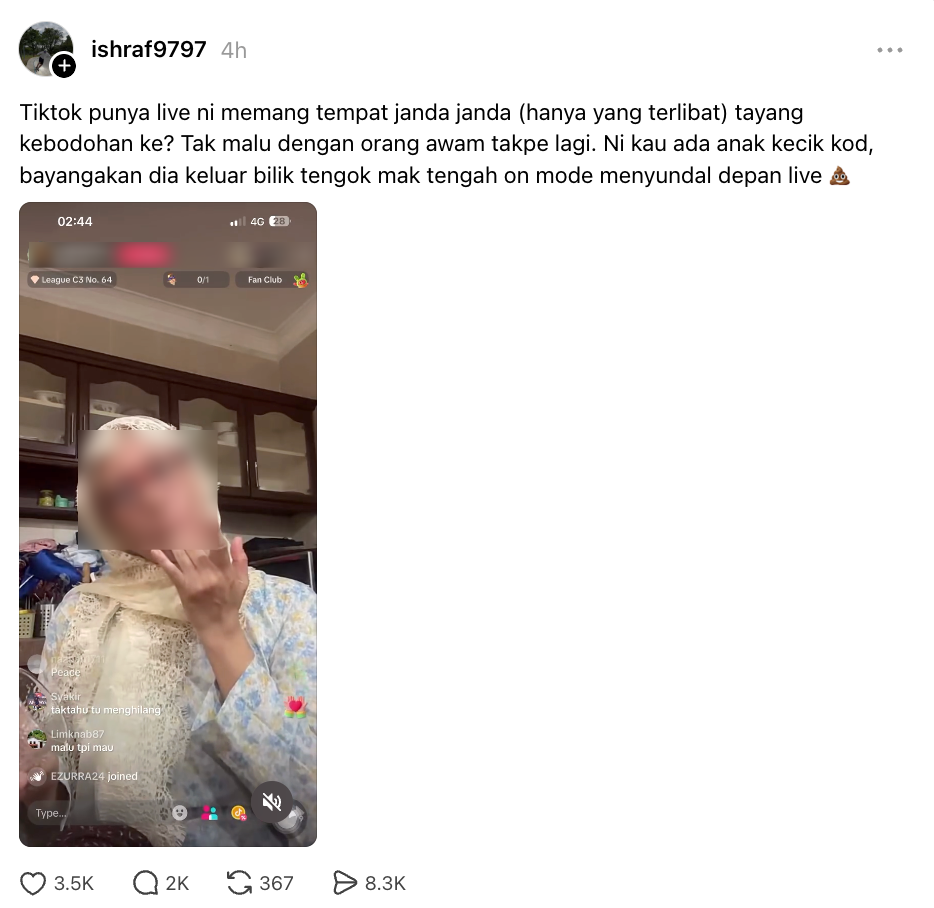 Menerusi hantaran yang dikongsi semula di Threads, wanita yang dikatakan sudah tidak mempunyai suami itu telah membuat siaran langsung menikmati minuman sambil melakukan aksi tidak senonoh sehingga membuatkan netizen yang menonton kurang senang.