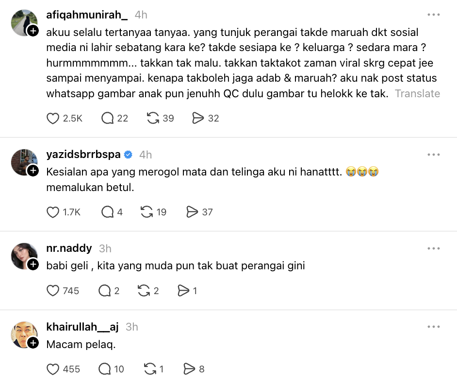 Mereka juga mempersoalkan adakah ahli keluarga wanita terbabit tidak menonton siaran langsung ataupun rakaman video sebegitu sehingga dia tidak mempunyai rasa malu ataupun segan sewaktu beraksi berahi.