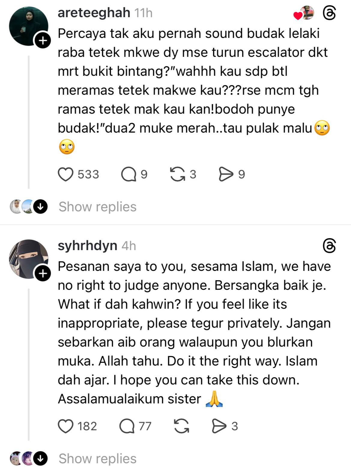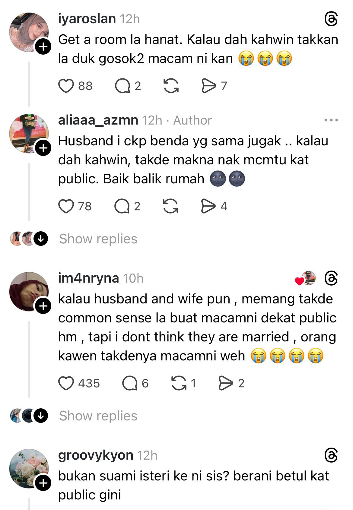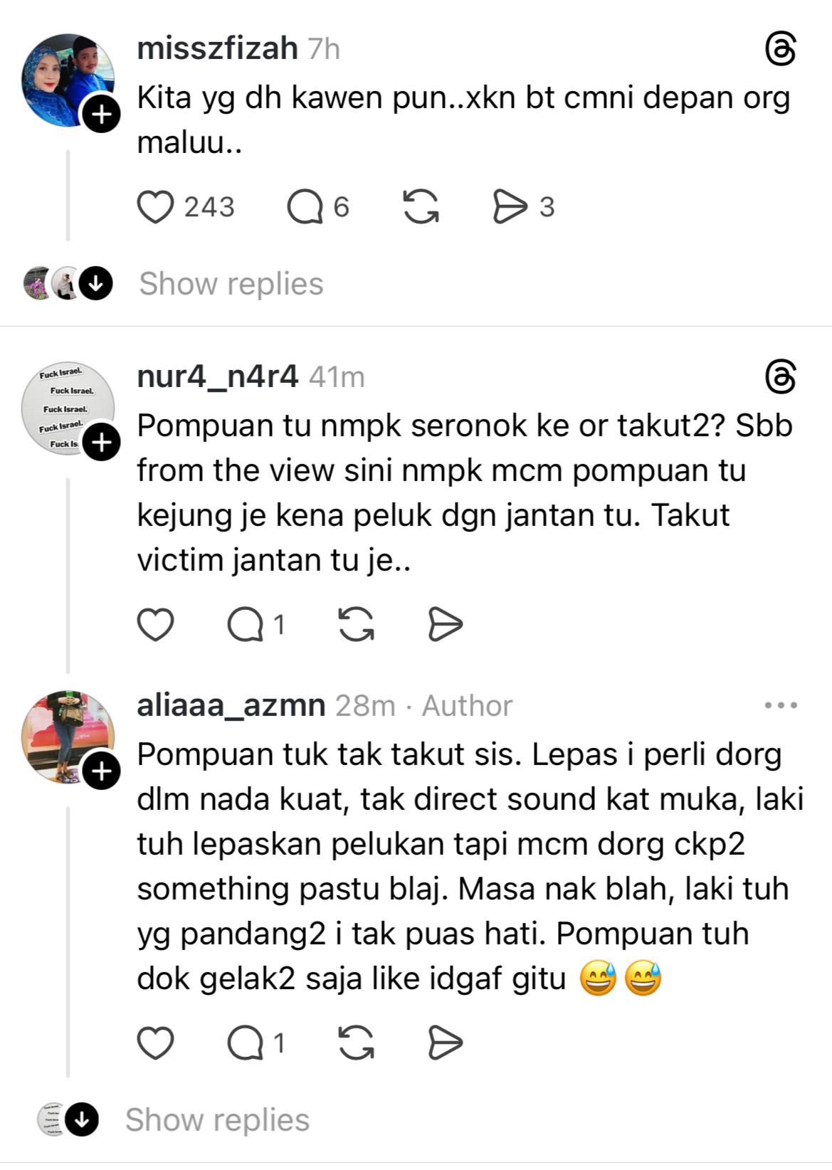 “Yang perempuan bukan main tudung labuh siap tutup dada, tapi kau bagi je pakwe peluk-peluk pinggang siap kejap-kejap gosok peha, peluk ketat-ketak sikit lagi nak kena tetek,” ciapan Alia di Threads.